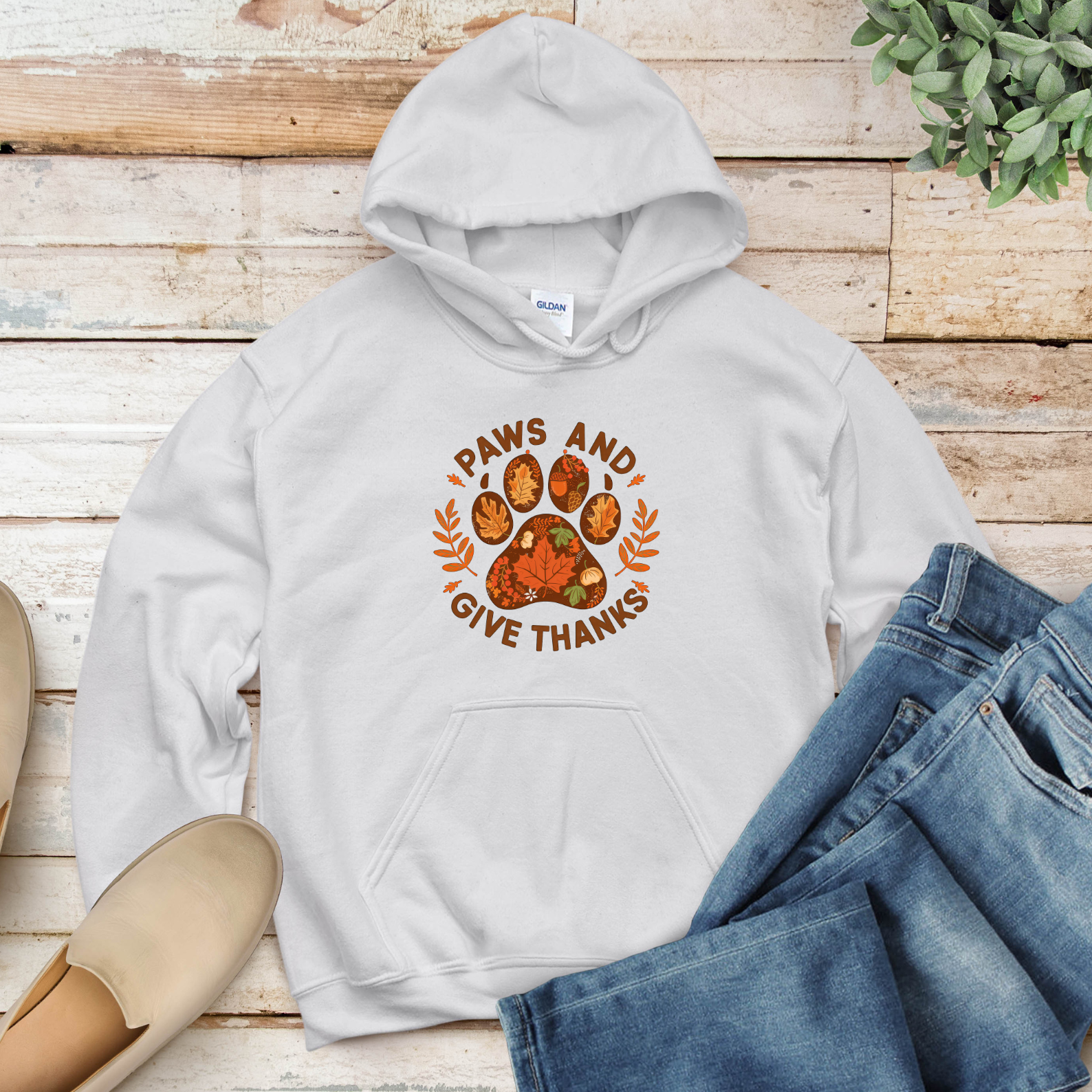 Wrap yourself in warmth and gratitude with this Paws and Give Thanks hooded sweatshirt — the perfect cozy companion for anyone who loves animals and a good dose of comfort. The soft, medium-heavy fabric blend keeps you snug through chilly days, while the classic fit make it effortlessly stylish and easy to wear. Whether you’re celebrating Thanksgiving, snuggling up with your furry friend, or just embracing this cozy season, this hooded sweatshirt brings heart and comfort together.